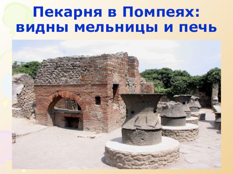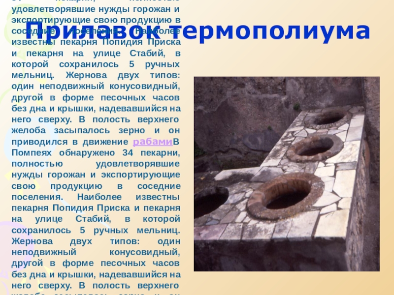 экспортирующие свою продукцию в соседние поселения. Наиболее известны пекарня Попидия Приска и пекарня на улице Стабий, в которой сохранилось 5 ручных мельницВ Помпеях обнаружено 34 пекарни, полностью удовлетворявшие нужды горожан и экспортирующие свою продукцию в соседние поселения. Наиболее известны пекарня Попидия Приска и пекарня на улице Стабий, в которой сохранилось 5 ручных мельниц. ЖерноваВ Помпеях обнаружено 34 пекарни, полностью удовлетворявшие нужды горожан и экспортирующие свою продукцию в соседние поселения. Наиболее известны пекарня Попидия Приска и пекарня на улице Стабий, в которой сохранилось 5 ручных мельниц. Жернова двух типов: один неподвижный конусовидный, другой в форме песочных часов без дна и крышки, надевавшийся на него сверху. В полость верхнего желоба засыпалось зерно и он приводился в движение рабамиВ Помпеях обнаружено 34 пекарни, полностью удовлетворявшие нужды горожан и экспортирующие свою продукцию в соседние поселения. Наиболее известны пекарня Попидия Приска и пекарня на улице Стабий, в которой сохранилось 5 ручных мельниц. Жернова двух типов: один неподвижный конусовидный, другой в форме песочных часов без дна и крышки, надевавшийся на него сверху. В полость верхнего желоба засыпалось зерно и он приводился в движение рабами или воламиВ Помпеях обнаружено 34 пекарни, полностью удовлетворявшие нужды горожан и экспортирующие свою продукцию в соседние поселения. Наиболее известны пекарня Попидия Приска и пекарня на улице Стабий, в которой сохранилось 5 ручных мельниц. Жернова двух типов: один неподвижный конусовидный, другой в форме песочных часов без дна и крышки, надевавшийся на него сверху. В полость верхнего желоба засыпалось зерно и он приводился в движение рабами или волами. Изготовлены жернова из вулканических пород. Многие пекарни не имели прилавков для продажи хлеба, либо поставляя его оптом, либо разнося по домам или продавая на улице с рук.