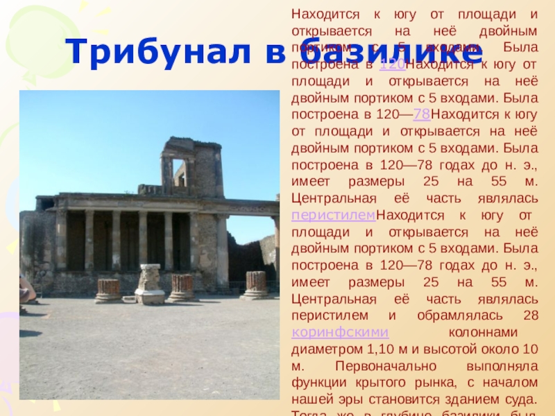 двойным портиком с 5 входами. Была построена в 120Находится к югу от площади и открывается на неё двойным портиком с 5 входами. Была построена в 120—78Находится к югу от площади и открывается на неё двойным портиком с 5 входами. Была построена в 120—78 годах до н. э., имеет размеры 25 на 55 м. Центральная её часть являлась перистилемНаходится к югу от площади и открывается на неё двойным портиком с 5 входами. Была построена в 120—78 годах до н. э., имеет размеры 25 на 55 м. Центральная её часть являлась перистилем и обрамлялась 28 коринфскими колоннами диаметром 1,10 м и высотой около 10 м. Первоначально выполняла функции крытого рынка, с началом нашей эры становится зданием суда. Тогда же в глубине базилики был построен двухэтажный «трибунал», часть которого сохранилась до наших дней.