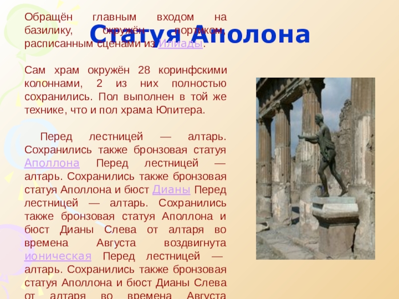 Перед лестницей — алтарь. Сохранились также бронзовая статуя Аполлона Перед лестницей — алтарь. Сохранились также бронзовая статуя Аполлона и бюст Дианы Перед лестницей — алтарь. Сохранились также бронзовая статуя Аполлона и бюст Дианы Слева от алтаря во времена Августа воздвигнута ионическая Перед лестницей — алтарь. Сохранились также бронзовая статуя Аполлона и бюст Дианы Слева от алтаря во времена Августа воздвигнута ионическая колонна для солнечных часов.