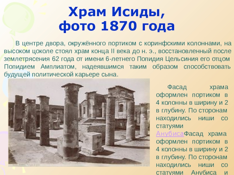Фасад храма оформлен портиком в 4 колонны в ширину и 2 в глубину. По сторонам находились ниши со статуями АнубисаФасад храма оформлен портиком в 4 колонны в ширину и 2 в глубину. По сторонам находились ниши со статуями Анубиса и ГарпократаФасад храма оформлен портиком в 4 колонны в ширину и 2 в глубину. По сторонам находились ниши со статуями Анубиса и Гарпократа. Также в храме была ёмкость с водой из Нила.