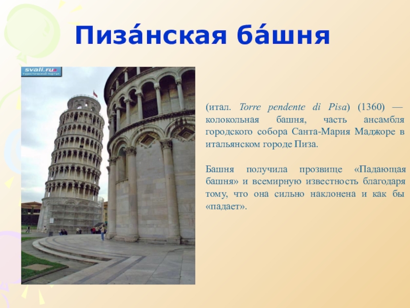 Башня получила прозвище «Падающая башня» и всемирную известность благодаря тому, что она сильно наклонена и как бы «падает».