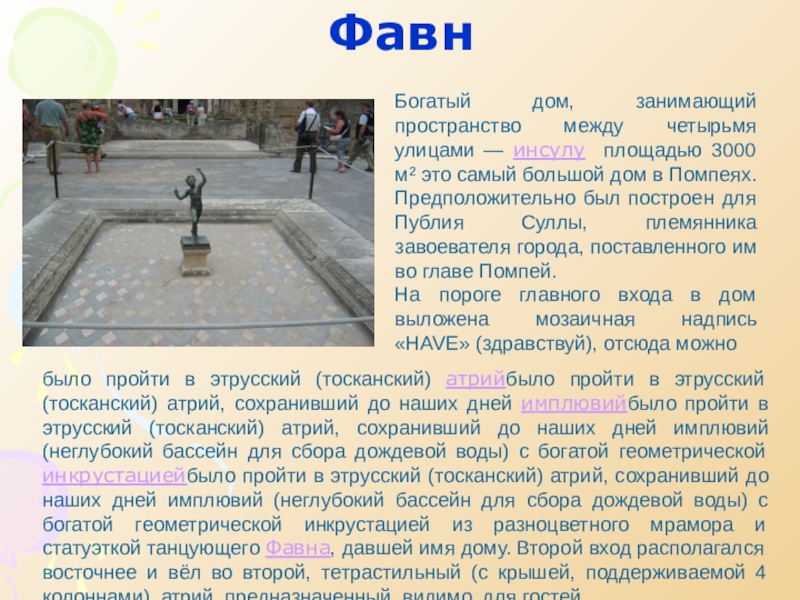 было пройти в этрусский (тосканский) атрийбыло пройти в этрусский (тосканский) атрий, сохранивший до наших дней имплювийбыло пройти в этрусский (тосканский) атрий, сохранивший до наших дней имплювий (неглубокий бассейн для сбора дождевой воды) с богатой геометрической инкрустациейбыло пройти в этрусский (тосканский) атрий, сохранивший до наших дней имплювий (неглубокий бассейн для сбора дождевой воды) с богатой геометрической инкрустацией из разноцветного мрамора и статуэткой танцующего Фавна, давшей имя дому. Второй вход располагался восточнее и вёл во второй, тетрастильный (с крышей, поддерживаемой 4 колоннами), атрий, предназначенный, видимо, для гостей.