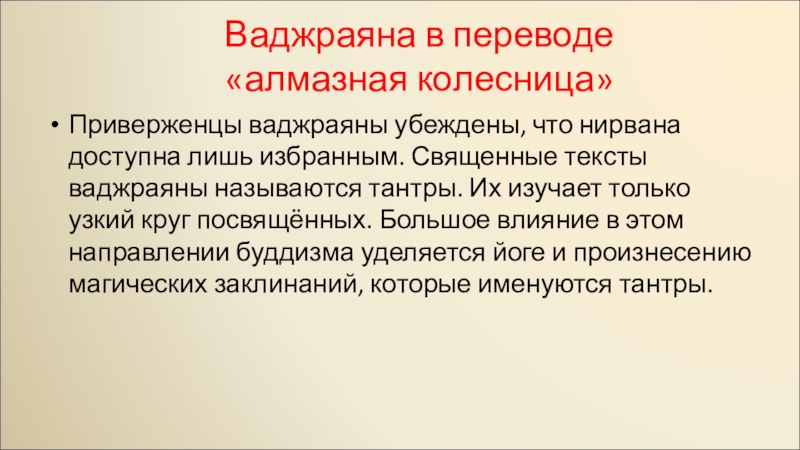 Приверженцы ваджраяны убеждены, что нирвана доступна лишь избранным. Священные тексты ваджраяны называются тантры. Их изучает только узкий круг посвящённых. Большое влияние в этом направлении буддизма уделяется йоге и произнесению магических заклинаний, которые именуются тантры.