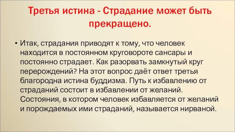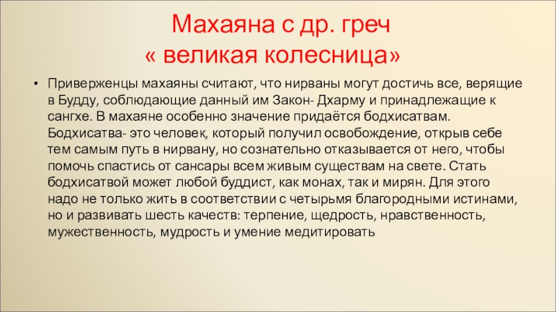 Приверженцы махаяны считают, что нирваны могут достичь все, верящие в Будду, соблюдающие данный им Закон- Дхарму и принадлежащие к сангхе. В махаяне особенно значение придаётся бодхисатвам. Бодхисатва- это человек, который получил освобождение, открыв себе тем самым путь в нирвану, но сознательно отказывается от него, чтобы помочь спастись от сансары всем живым существам на свете. Стать бодхисатвой может любой буддист, как монах, так и мирян. Для этого надо не только жить в соответствии с четырьмя благородными истинами, но и развивать шесть качеств: терпение, щедрость, нравственность, мужественность, мудрость и умение медитировать