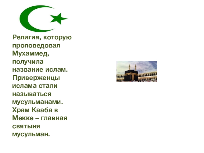 Религия, которую проповедовал Мухаммед, получила название ислам. Приверженцы ислама стали называться мусульманами. Храм Кааба в Мекке –