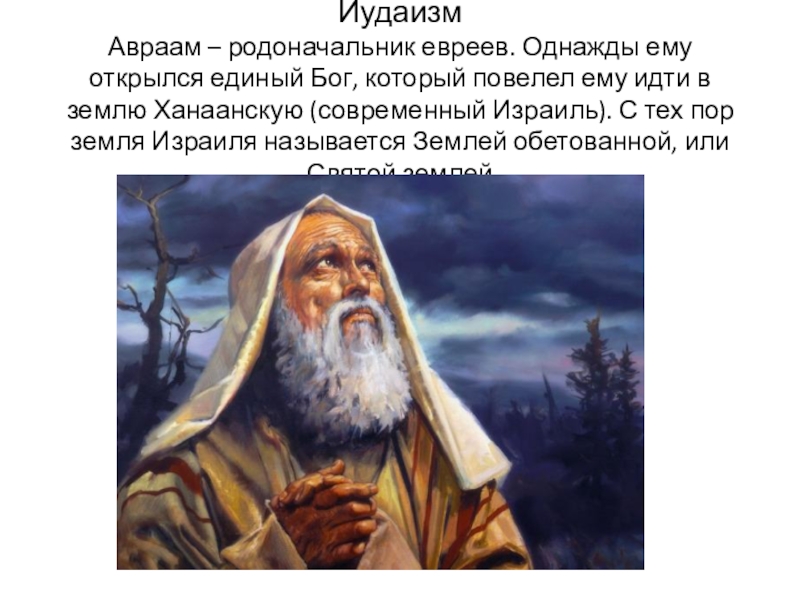 Иудаизм Авраам – родоначальник евреев. Однажды ему открылся единый Бог, который повелел ему идти в землю Ханаанскую (современный Израиль). С тех пор земля Израиля называется Землей обетованной, или Святой землей