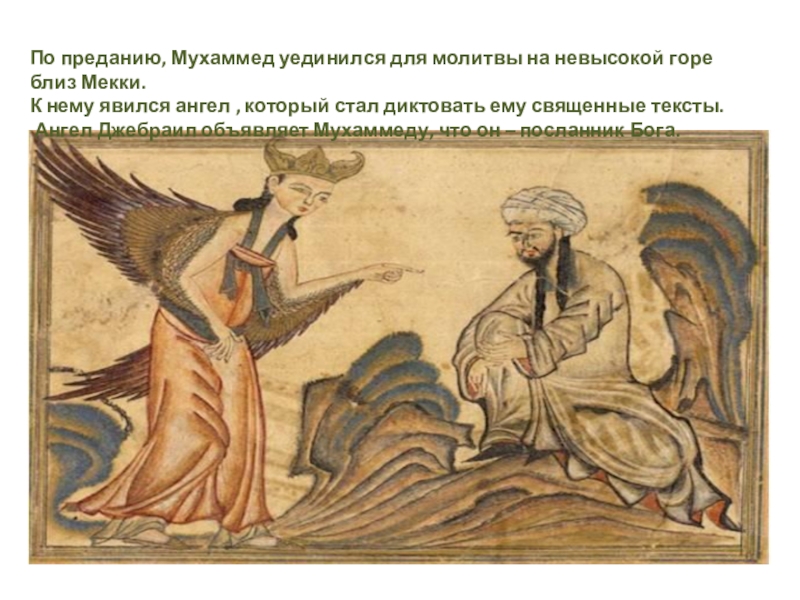 Слайд 19По преданию, Мухаммед уединился для молитвы на невысокой горе близ Мекки.
