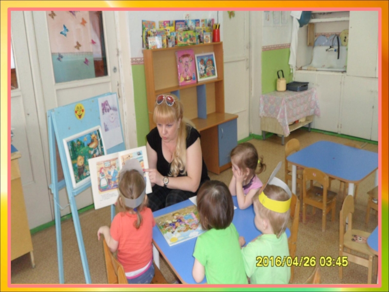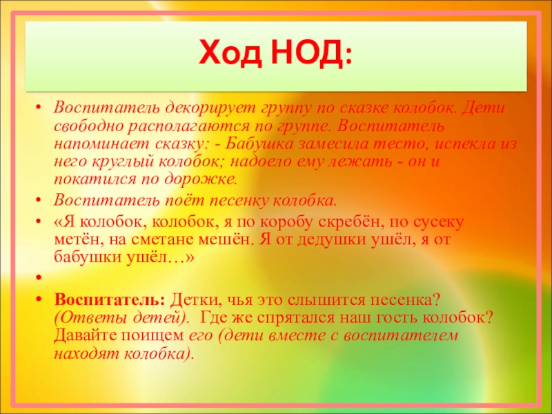 Воспитатель: Конечно ребята знают сказку про тебя, садись, пожалуйста, на стул и послушай. Ребятки, давайте вспомним, кого колобок встретил по дороге? (Ответы детей). Какую песенку пел колобок? Давайте вместе споём колобку песенку.( Дети поют песенку.)
