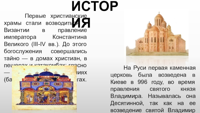 На Руси первая каменная церковь была возведена в Киеве в 996 году, во время правления святого князя Владимира. Называлась она Десятинной, так как на ее возведение святой Владимир выделил десятую часть своих доходов — десятину.