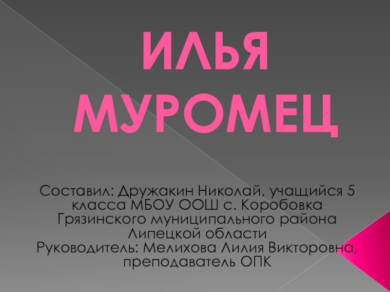 ИЛЬЯ  МУРОМЕЦСоставил: Дружакин Николай, учащийся 5 класса МБОУ ООШ с. Коробовка Грязинского муниципального районаЛипецкой областиРуководитель: Мелихова