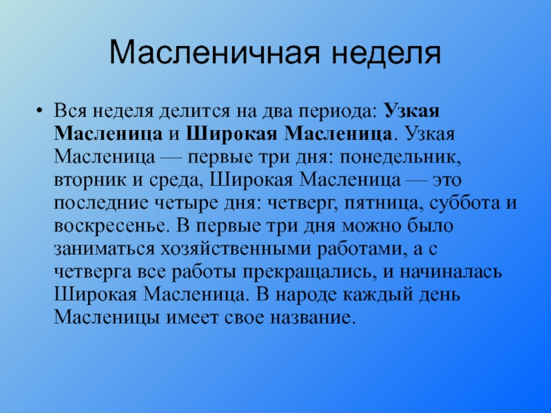 Вся неделя делится на два периода: Узкая Масленица и Широкая Масленица. Узкая Масленица —