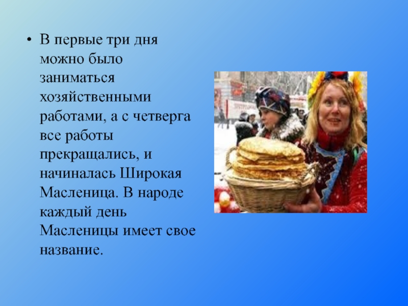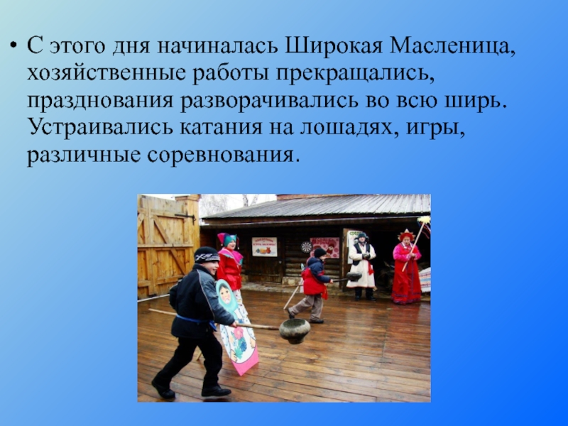 Слайд 14С этого дня начиналась Широкая Масленица, хозяйственные работы прекращались, празднования разворачивались
