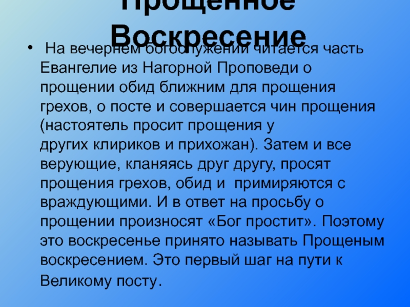 о прощении обид ближним для прощения грехов, о посте и совершается чин прощения (настоятель просит прощения у других клириков и прихожан). Затем и все верующие, кланяясь друг другу, просят прощения грехов, обид и примиряются с враждующими. И в ответ на просьбу о прощении произносят «Бог простит». Поэтому это воскресенье принято называть Прощеным воскресением. Это первый шаг на пути к Великому посту.