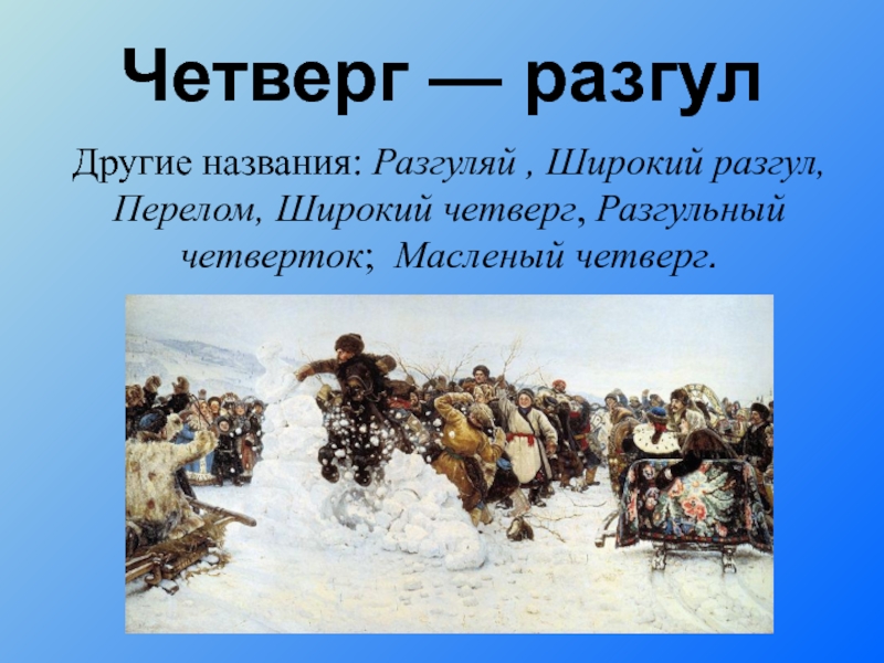 Другие названия: Разгуляй , Широкий разгул, Перелом, Широкий четверг, Разгульный четверток; Масленый