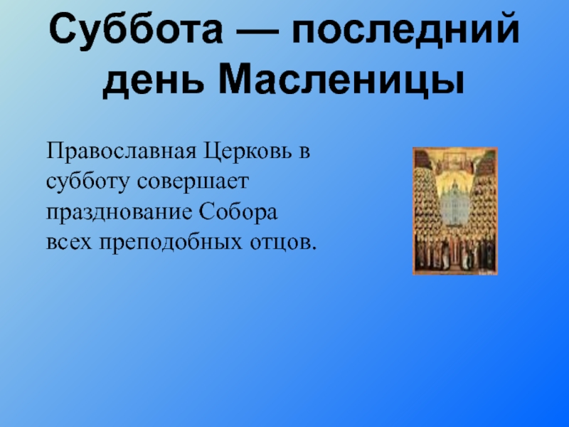 Слайд 16Суббота — последний день Масленицы