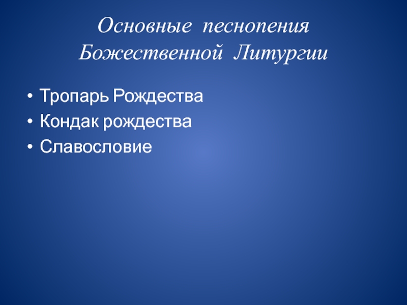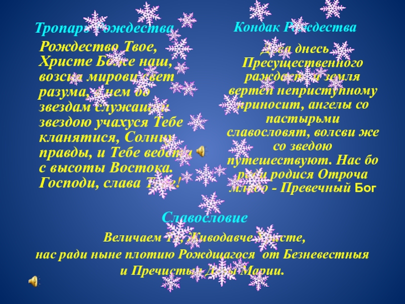 Рождество Твое, Христе Боже наш, возсия мирови свет разума, в нем бо звездам служащии звездою учахуся Тебе кланятися, Солнцу правды, и Тебе ведети с высоты Востока. Господи, слава Тебе!