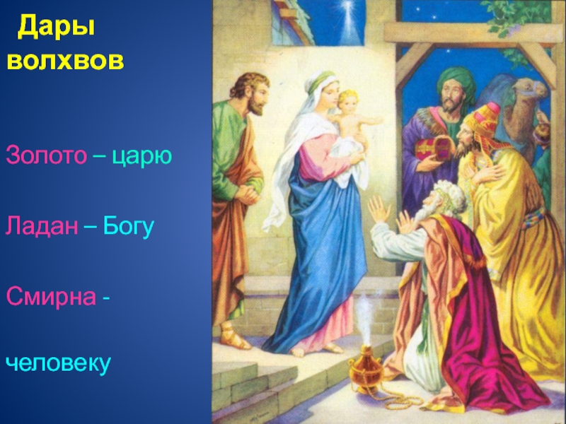 Дева днесь Пресущественного раждает, и земля вертеп неприступному приносит, ангелы со пастырьми славословят, волсви же со зведою путешествуют. Нас бо ради родися Отроча младо - Превечный Бог