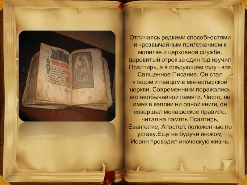 Слайд 5Отличаясь редкими способностями и чрезвычайным прилежанием к молитве и церковной службе,