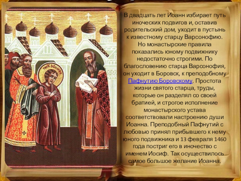 дом, уходит в пустынь к известному старцу Варсонофию. Но монастырские правила показались юному подвижнику недостаточно строгими. По благословению старца Варсонофия, он уходит в Боровск, к преподобному Пафнутию Боровскому. Простота жизни святого старца, труды, которые он разделял со своей братией, и строгое исполнение монастырского устава соответствовали настроению души Иоанна. Преподобный Пафнутий с любовью принял прибывшего к нему юного подвижника и 13 февраля 1460 года постриг его в иночество с именем Иосиф. Так осуществилось самое большое желание Иоанна.
