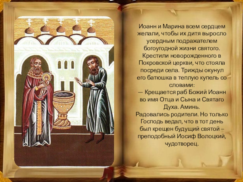 Радовались родители. Но только Господь ведал, что в тот день был крещен будущий святой – преподобный Иосиф Волоцкий, чудотворец.