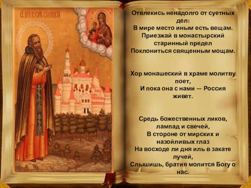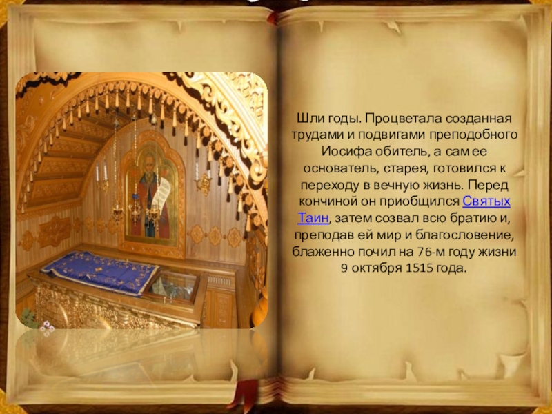 Слайд 24Шли годы. Процветала созданная трудами и подвигами преподобного Иосифа обитель, а