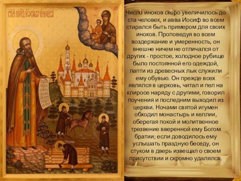 Слайд 11Число иноков скоро увеличилось до ста человек, и авва Иосиф во