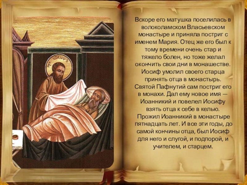 с именем Мария. Отец же его был к тому времени очень стар и тяжело болен, но тоже желал окончить свои дни в монашестве. Иосиф умолил своего старца принять отца в монастырь. Святой Пафнутий сам постриг его в монахи. Дал ему новое имя — Иоанникий и повелел Иосифу взять отца к себе в келью.