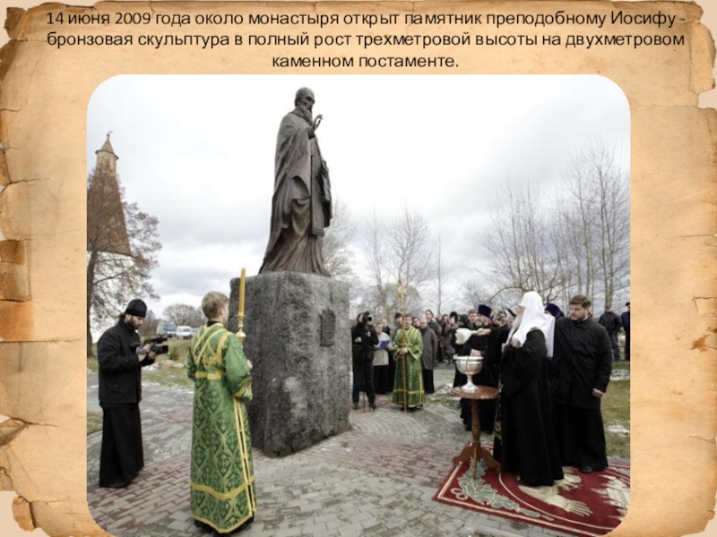 Слайд 2914 июня 2009 года около монастыря открыт памятник преподобному Иосифу -