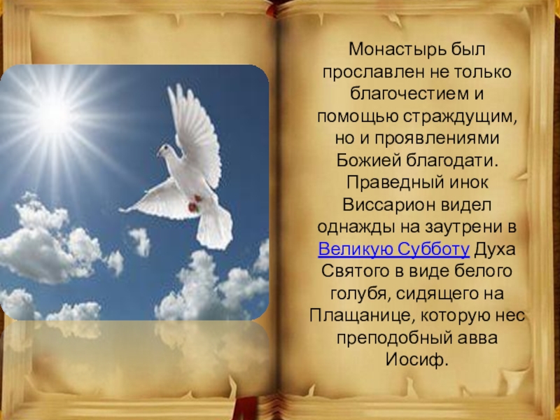 проявлениями Божией благодати. Праведный инок Виссарион видел однажды на заутрени в Великую Субботу Духа Святого в виде белого голубя, сидящего на Плащанице, которую нес преподобный авва Иосиф.