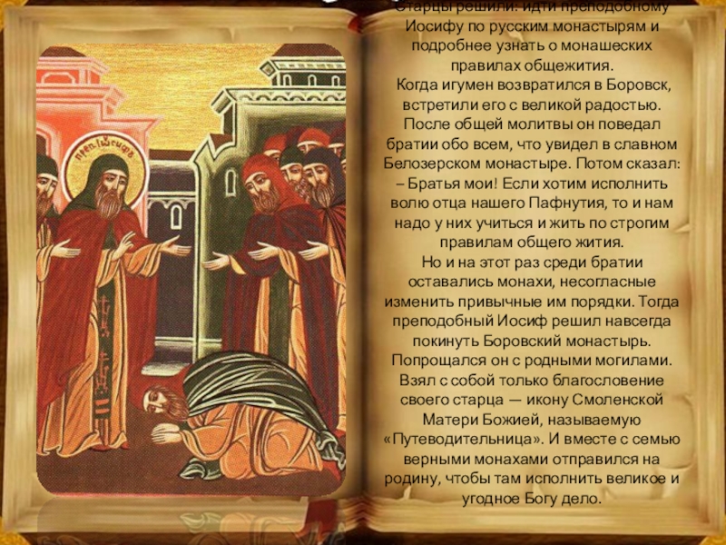 Слайд 9Старцы решили: идти преподобному Иосифу по русским монастырям и подробнее узнать