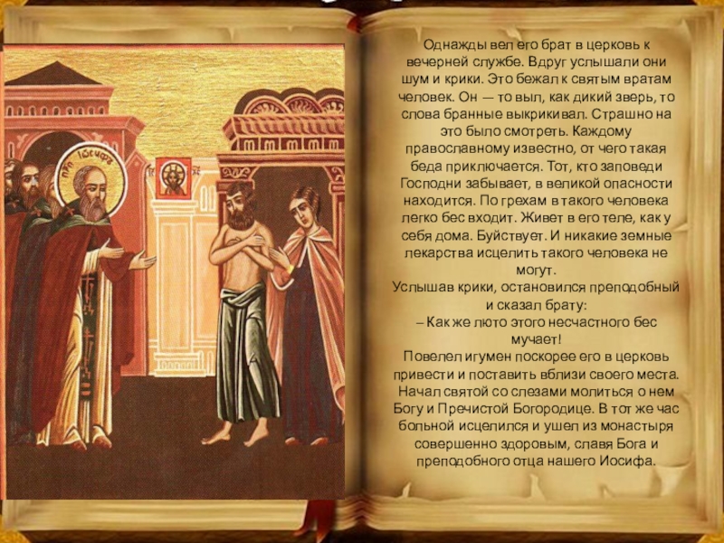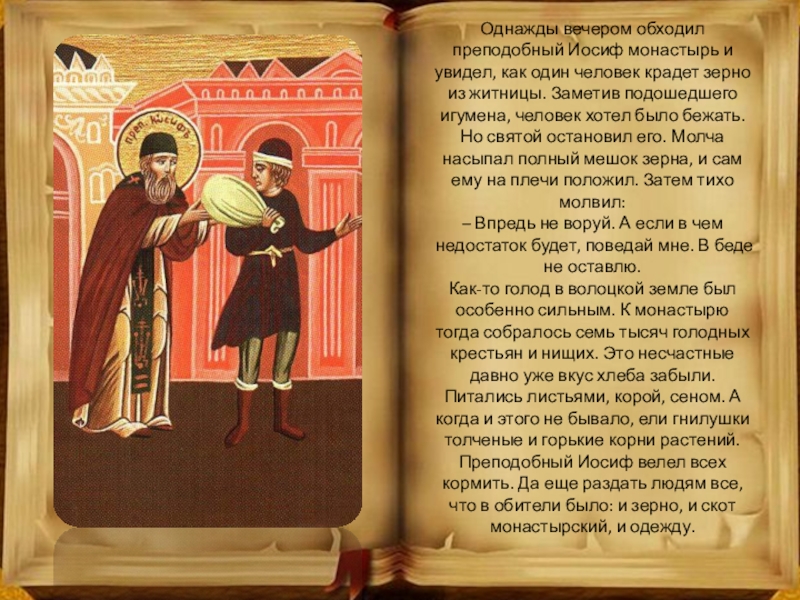 Слайд 14Однажды вечером обходил преподобный Иосиф монастырь и увидел, как один человек