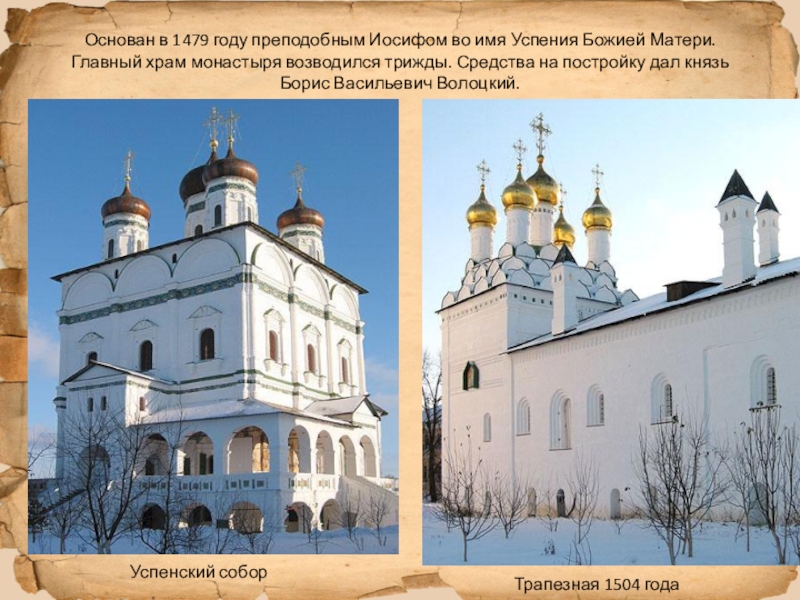 Слайд 27Основан в 1479 году преподобным Иосифом во имя Успения Божией Матери. Главный храм монастыря
