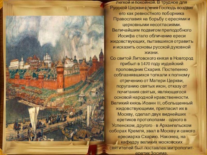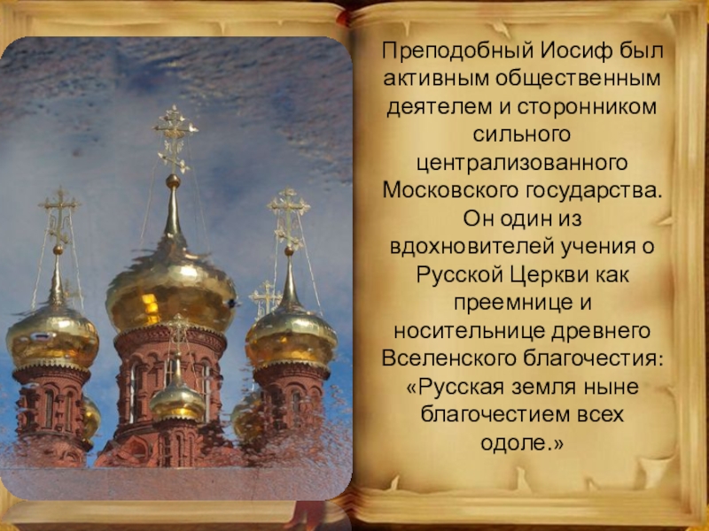 Слайд 22Преподобный Иосиф был активным общественным деятелем и сторонником сильного централизованного Московского