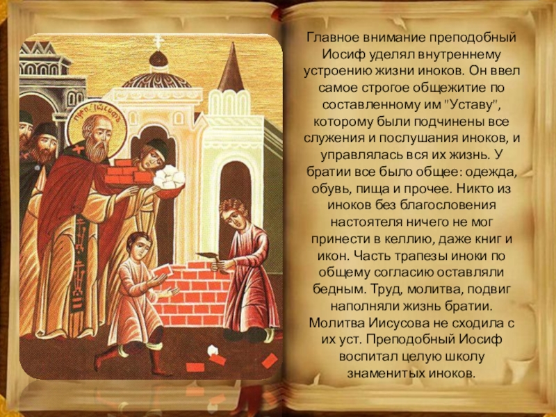 Слайд 12Главное внимание преподобный Иосиф уделял внутреннему устроению жизни иноков. Он ввел