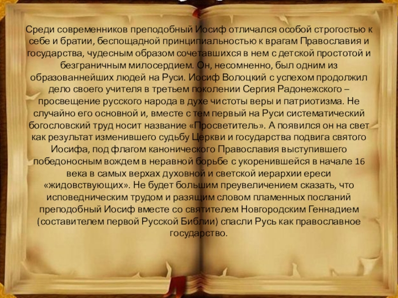 беспощадной принципиальностью к врагам Православия и государства, чудесным образом сочетавшихся в нем с детской простотой и безграничным милосердием. Он, несомненно, был одним из образованнейших людей на Руси. Иосиф Волоцкий с успехом продолжил дело своего учителя в третьем поколении Сергия Радонежского – просвещение русского народа в духе чистоты веры и патриотизма. Не случайно его основной и, вместе с тем первый на Руси систематический богословский труд носит название «Просветитель». А появился он на свет как результат изменившего судьбу Церкви и государства подвига святого Иосифа, под флагом канонического Православия выступившего победоносным вождем в неравной борьбе с укоренившейся в начале 16 века в самых верхах духовной и светской иерархии ереси «жидовствующих». Не будет большим преувеличением сказать, что исповедническим трудом и разящим словом пламенных посланий преподобный Иосиф вместе со святителем Новгородским Геннадием (составителем первой Русской Библии) спасли Русь как православное государство.