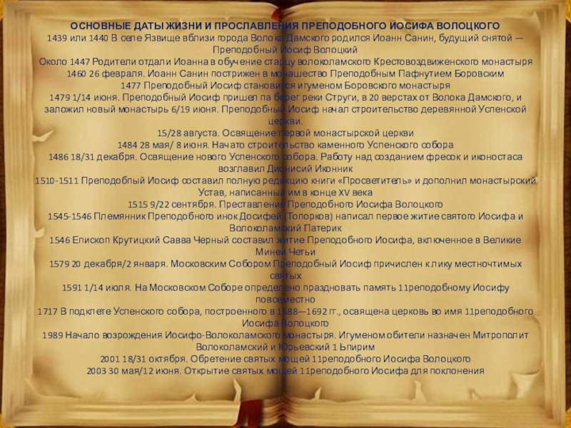 Слайд 32ОСНОВНЫЕ ДАТЫ ЖИЗНИ И ПРОСЛАВЛЕНИЯ ПРЕПОДОБНОГО ИОСИФА ВОЛОЦКОГО