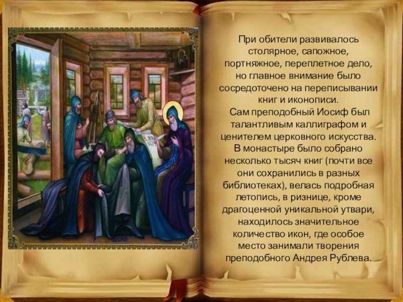 Слайд 18При обители развивалось столярное, сапожное, портняжное, переплетное дело, но главное внимание