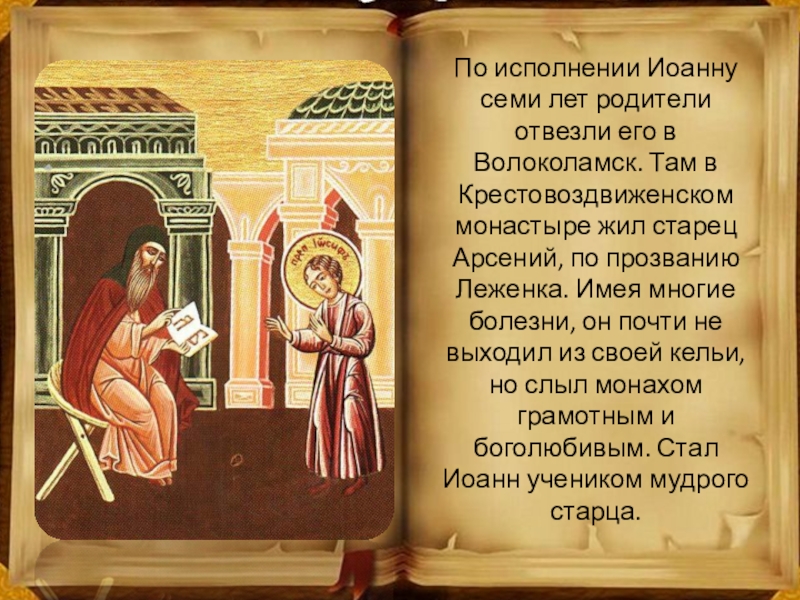 Слайд 4По исполнении Иоанну семи лет родители отвезли его в Волоколамск. Там