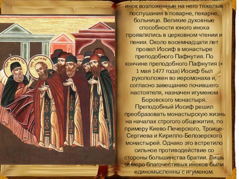 послушания в поварне, пекарне, больнице. Великие духовные способности юного инока проявлялись в церковном чтении и пении. Около восемнадцати лет провел Иосиф в монастыре преподобного Пафнутия. По кончине преподобного Пафнутия (+ 1 мая 1477 года) Иосиф был рукоположен во иеромонаха и, согласно завещанию почившего настоятеля, назначен игуменом Боровского монастыря. Преподобный Иосиф решил преобразовать монастырскую жизнь на началах строгого общежития, по примеру Киево-Печерского, Троице-Сергиева и Кирилло-Белозерского монастырей. Однако это встретило сильное противодействие со стороны большинства братии. Лишь семеро благочестивых иноков были единомысленны с игуменом.
