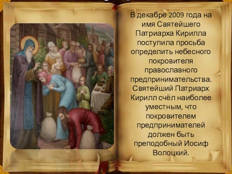 определить небесного покровителя православного предпринимательства. Святейший Патриарх Кирилл счёл наиболее уместным, что покровителем предпринимателей должен быть преподобный Иосиф Волоцкий.