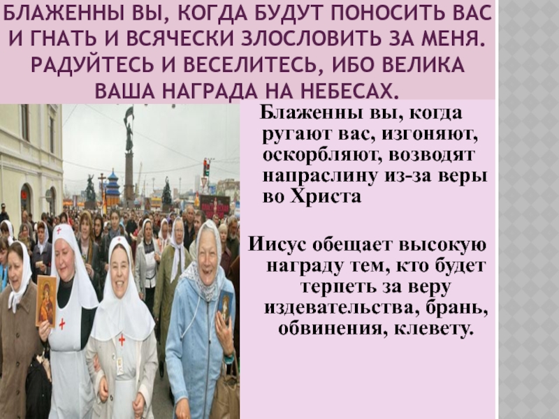 Блаженны вы, когда ругают вас, изгоняют, оскорбляют, возводят напраслину из-за веры во Христа
