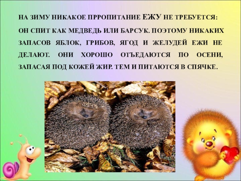 Слайд 12НА ЗИМУ НИКАКОЕ ПРРОПИТАНИЕ ЕЖУ НЕ ТРЕБУЕТСЯ: