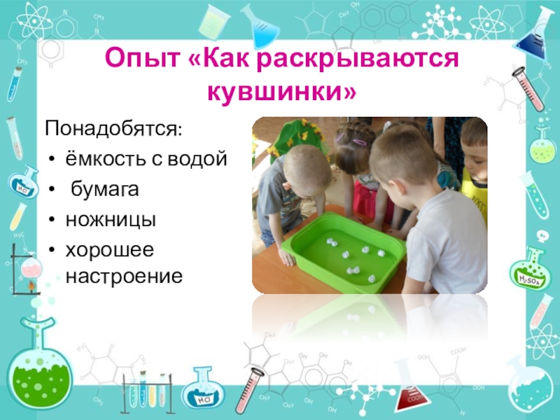 Опыт «Как раскрываются кувшинки»Понадобятся:ёмкость с водой бумаганожницыхорошее настроение