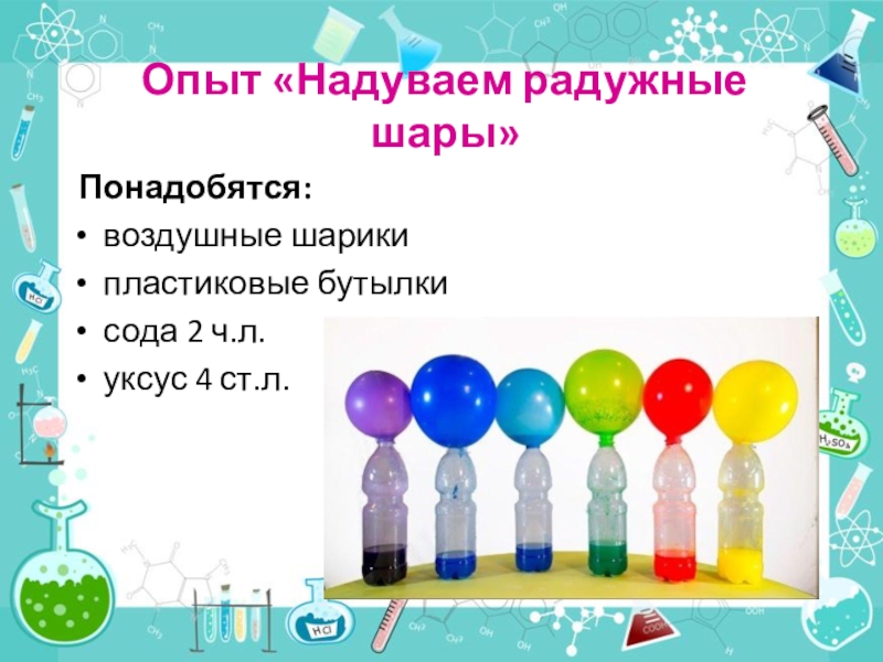Опыт «Надуваем радужные шары» Понадобятся:воздушные шарикипластиковые бутылкисода 2 ч.л.уксус 4 ст.л.