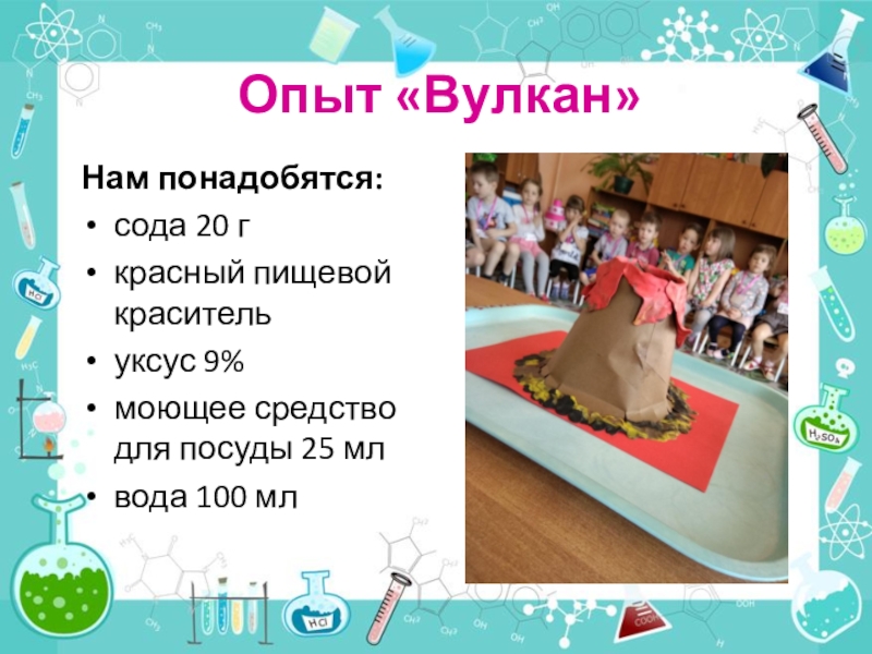 Опыт «Вулкан»Нам понадобятся:сода 20 гкрасный пищевой красительуксус 9%моющее средство для посуды 25 млвода 100 мл