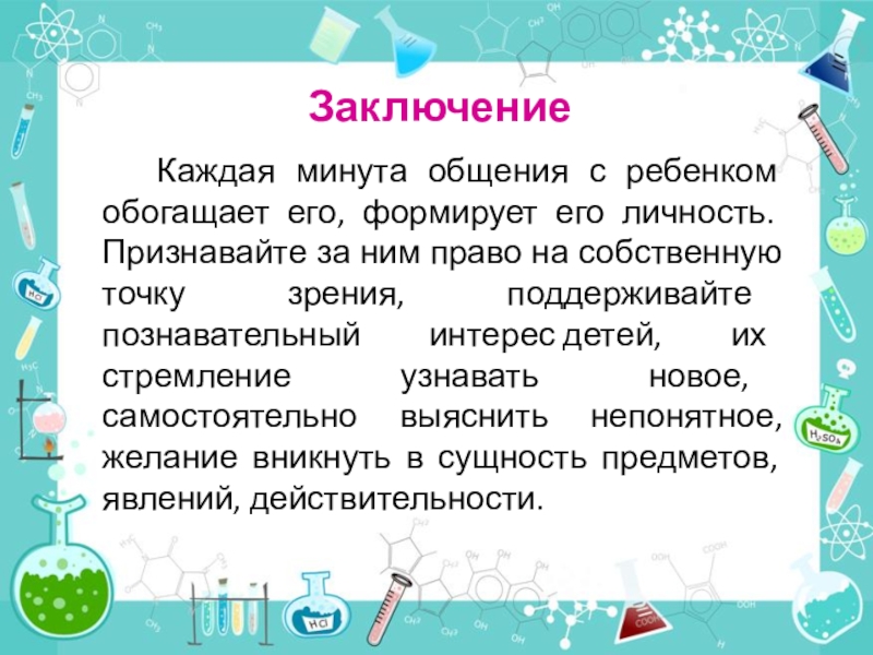 Заключение  		Каждая минута общения с ребенком обогащает его, формирует его личность. Признавайте за ним право на