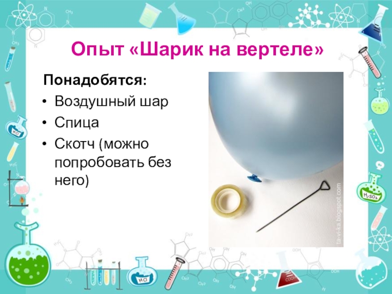 Опыт «Шарик на вертеле» Понадобятся:Воздушный шарСпицаСкотч (можно попробовать без него)