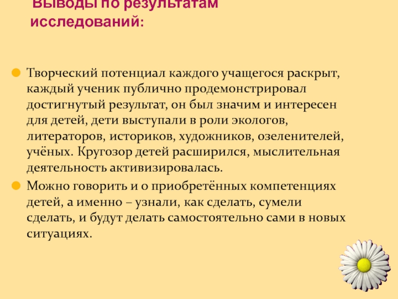 публично продемонстрировал достигнутый результат, он был значим и интересен для детей, дети выступали в роли экологов, литераторов, историков, художников, озеленителей, учёных. Кругозор детей расширился, мыслительная деятельность активизировалась.