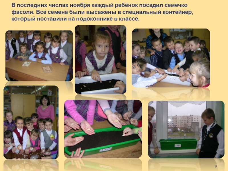 были высажены в специальный контейнер, который поставили на подоконнике в классе.