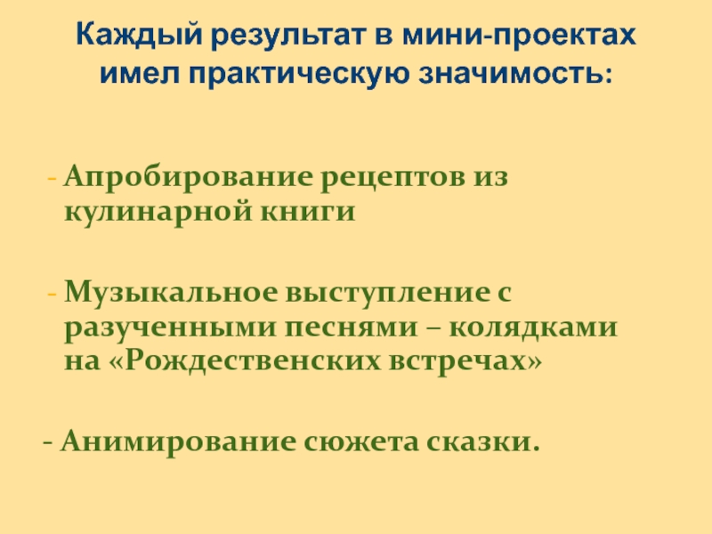 Слайд 30Каждый результат в мини-проектах имел практическую значимость: